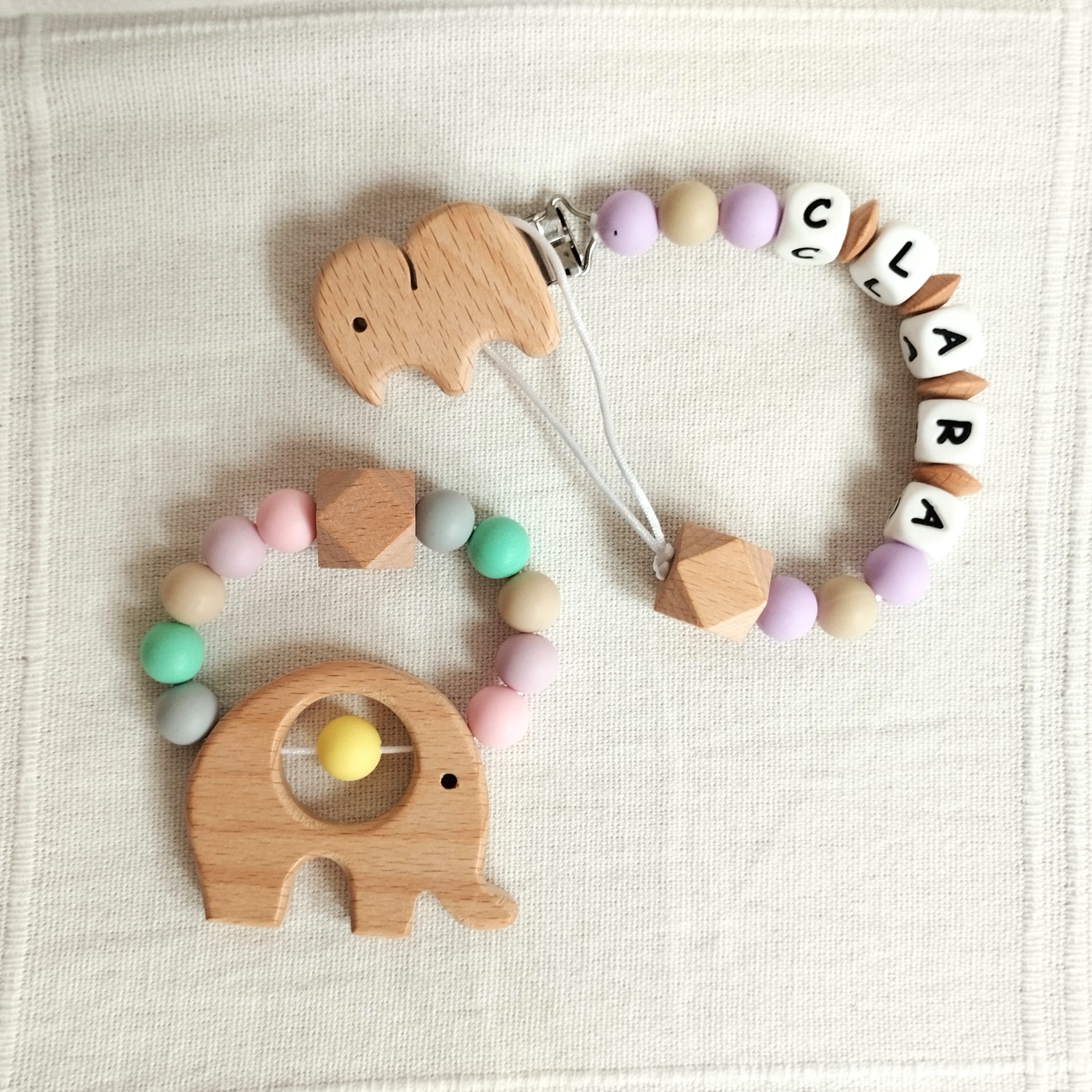 Personalizados con su nombre y elaborados con materiales seguros, mantienen el chupete siempre a mano y evitan que caiga al suelo. Pequeños tesoros únicos creados para acompañar a tu bebé en su día a día.